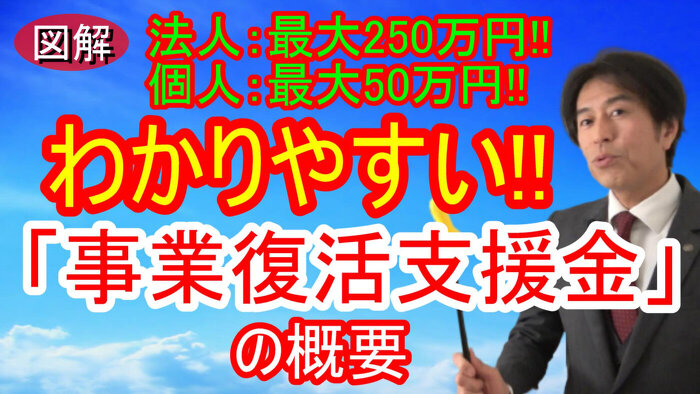 2022年01月20日(木) おしらせ 「動画」をアップしました。事業復活支援金の【概要】を図解でわかりやすく解説!法人最大250万円!個人最大50万円! YouTubeが開きます。 https://youtu.be/Kp-iyrPH3lU 事業復活支援金の【概要】を図解でわかりやすく解説!法人最大250万円!個人最大50万円!