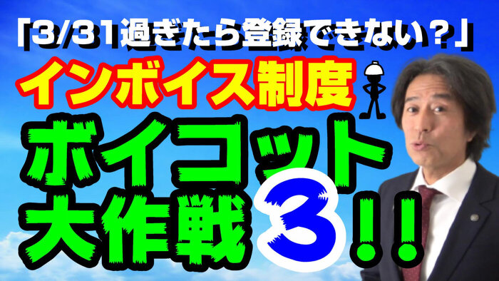 2022年11月09日(水) おしらせ 消費税インボイス制度「ボイコット大作戦3(完結編)」 YouTubeが開きます。 https://youtu.be/9zZN06fkDFA 登録申請期限の3月31日を過ぎても登録申請できますのでご安心ください!9月30日までギリギリ待っても怖くない!ということです。
