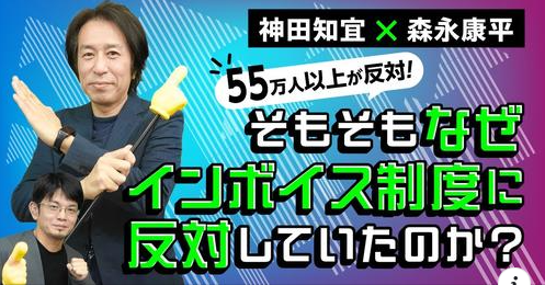 2024年01月05日(金) おしらせ 【後編】経済アナリスト森永康平氏のビズアップチャンネルにゲスト出演(対談動画)! 【後編】経済アナリスト森永康平氏のビズアップチャンネルにゲスト出演(対談動画)! https://youtu.be/pCU6HzIK3sk?si=U-I_8UZ_QM5ZWA2K 【第141回】55万人以上が反対! そもそもなぜインボイス制度に反対していたのか?(神田知宜×森永康平)