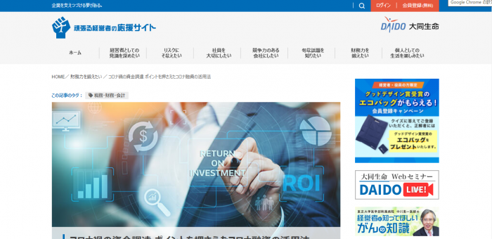 2020年12月25日(金) おしらせ 大同生命「頑張る経営者の応援サイト」に寄稿しました!コロナ禍の資金調達 ポイントを押さえたコロナ融資の活用法 大同生命「頑張る経営者の応援サイト」 ■コロナ禍の資金調達 ポイントを押さえたコロナ融資の活用法 https://www.ganbarusite-daido.jp/report/finance/bp600023/ ※会員登録(無料)していただくと、全文閲覧可能となります。